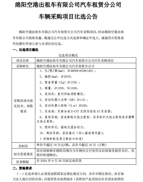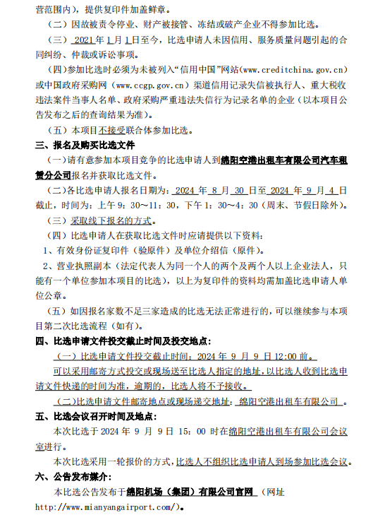 綿陽空港出租車有限公司汽車租賃分公司車輛采購項(xiàng)目比選公告