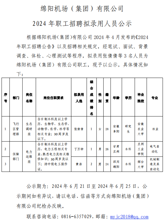 綿陽機場(集團)有限公司 2024 年職工招聘擬錄用人員公示